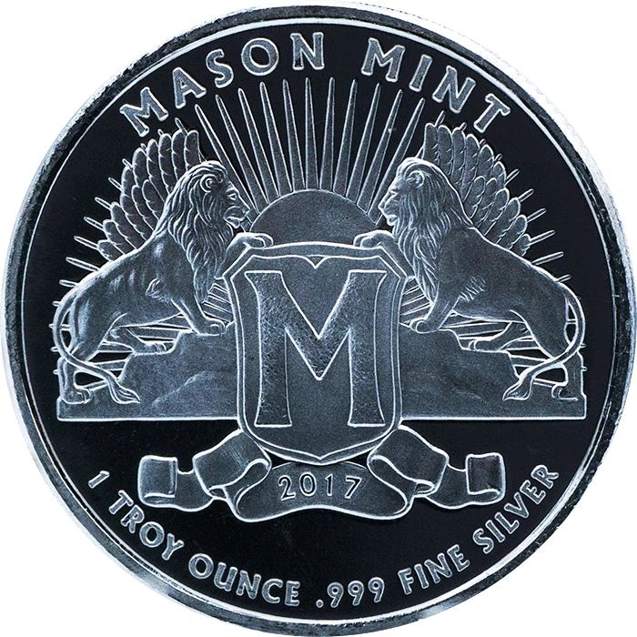 El anverso muestra leones alados a ambos lados de un escudo de armas con la letra M. Además, el anverso contiene la inscripción "MASON MINT" e información sobre el año, el peso y la prueba de lingotes.