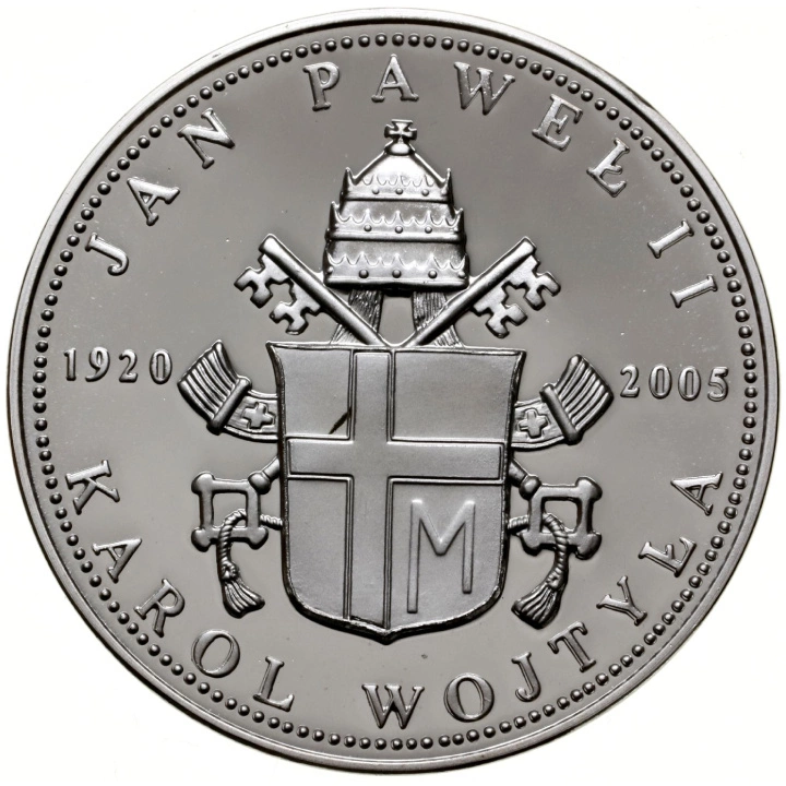 En el reverso se encuentra el escudo de armas de Juan Pablo II, así como las inscripciones "JUAN PABLO II" y "KAROL WOJTYŁA".