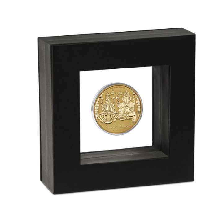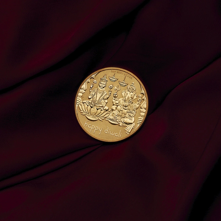 En el reverso aparecen Ganesha, el dios con cabeza de elefante y figura humana, y la diosa Lakshmi. En el reverso también aparece la inscripción "HAPPY DIWALI" e información sobre el peso y la pureza del lingote.