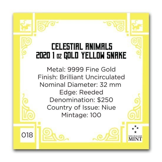 La serpiente de oro de una onza se acuñó a partir de lingotes de oro puro 9999, y está acuñada por el conocido productor de productos locativos New Zealand Mint. Cabe destacar que la moneda de oro 2020 se ha acuñado en una tirada muy reducida de 100 piezas y se entrega en un estuche exclusivo con certificado de autenticidad.