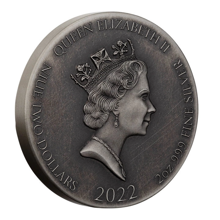 El Anverso de la moneda de plata muestra la efigie de la reina Isabel II y el escudo de armas de Niue. En el anverso también figura información sobre el peso, la pureza del lingote, el país emisor, el valor nominal y el año de acuñación.