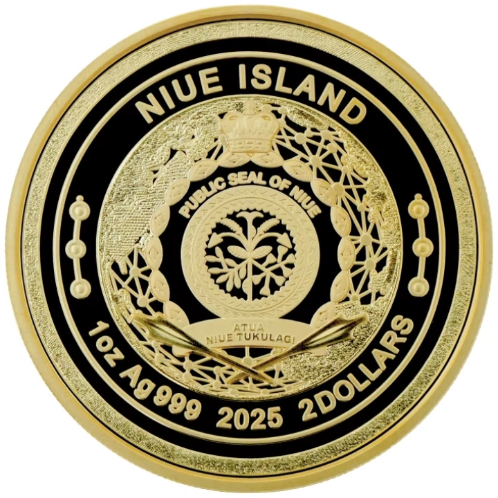 El anverso de la moneda de plata muestra el escudo de Niue, con la inscripción "NIUE ISLAND 2025". En el anverso también figuran la denominación, el peso y la pureza del metal del que está hecha la moneda.