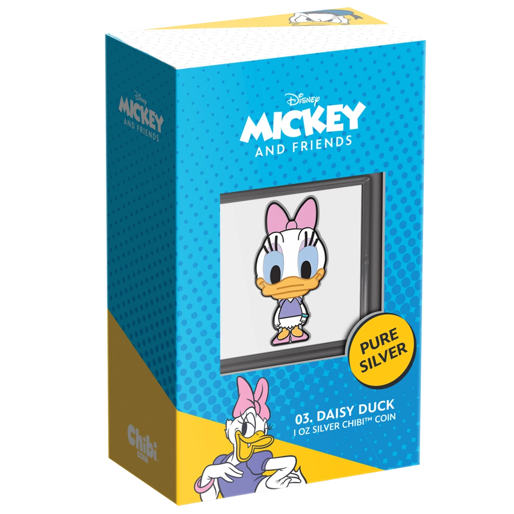 Daisy Chibi Coin coloreada de 1 onza de Plata 2021 Proof es una moneda emitida dentro de la serie Disney – Chibi Coins. La moneda representa al personaje Daisy Duck en el característico estilo Chibi, con una cabeza grande y un cuerpo relativamente pequeño, lo que le confiere un aspecto tierno y simpático. La moneda ha sido acuñada por New Zealand Mint en una onza de plata pura de ley .999 y en calidad proof. La emisión está limitada a 2.000 unidades en todo el mundo, y cada ejemplar se entrega en su caja original junto con un certificado de autenticidad.