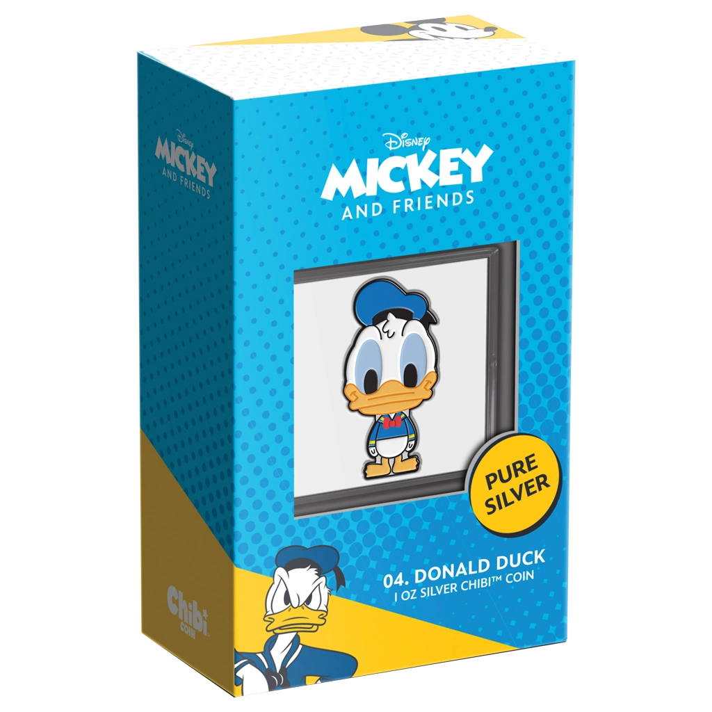 Donald Chibi Coin coloreada 1 onza de plata 2021 Proof es una moneda emitida dentro de la serie Disney – Chibi Coins. La moneda representa al Pato Donald en el característico estilo Chibi, con una cabeza grande y un cuerpo relativamente pequeño, lo que le confiere un aspecto encantador y divertido. Fue acuñada con una onza de plata pura de ley 999 en calidad proof por New Zealand Mint. La emisión está limitada a 2.000 unidades en todo el mundo y cada ejemplar se entrega en su caja original junto con un certificado de autenticidad.