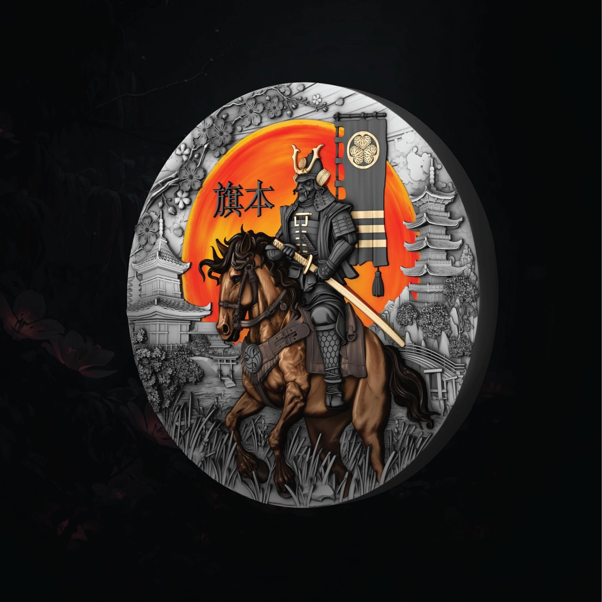El motivo principal de la moneda hace referencia a la simbología de la lealtad, el coraje y el honor, virtudes que constituyeron la base del código samurái. Los Hatamoto – guerreros de élite y estandartes vivientes del deber – aparecen representados con armadura completa, lo que refleja tanto su importancia histórica como sus valores atemporales.