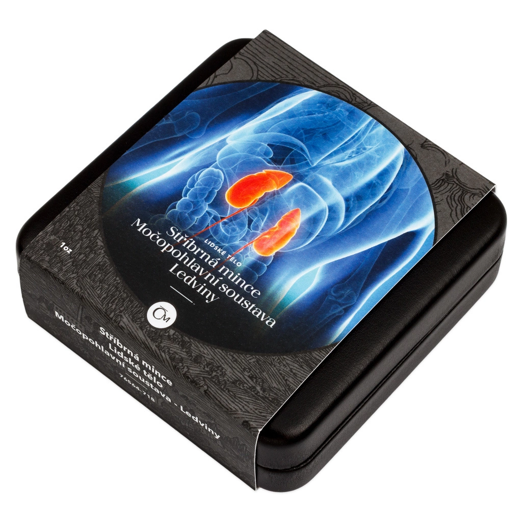 Human Body: Riñones coloreada 1 onza Plata 2025 Proof es la quinta moneda de plata de la serie "Human Body" de la Casa de Moneda Checa, dedicada al sistema urinario, específicamente a los riñones. El sistema urinario y el reproductivo están estrechamente relacionados en su desarrollo, pero sus funciones difieren significativamente. El sistema reproductivo se encarga de la reproducción, es decir, de transferir la información genética de los padres a la descendencia, mientras que el sistema urinario elimina los productos de desecho producidos durante la conversión de sustancias en nutrientes. Por las riñones pasa aproximadamente 1 litro de sangre por minuto, y un adulto filtra hasta 2.000 litros al día. El volumen diario de orina es aproximadamente de 1,5 litros.