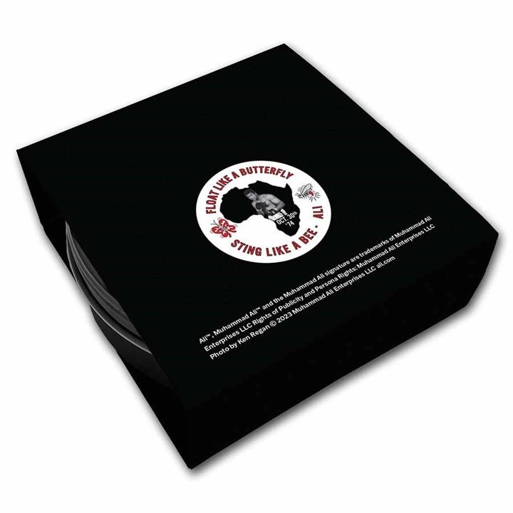 Los anversos muestran a Muhammad Ali con guantes de boxeo e incluyen la inscripción "MUHAMMAD ALI".