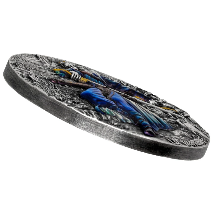 La moneda de plata de Niue: Eight Immortals – Lü Dongbin coloreada, bañada en oro de 2 onzas de plata 2023 Ultra High Relief Antiqued Coin es el segundo ejemplar de la serie "The Immortal Eight". Lü Dongbin es uno de los más famosos de los Ocho Inmortales en la mitología china y el taoísmo. Se le suele representar como un erudito, portando una espada para ahuyentar el mal y un abanico. Es venerado por los enfermos y respetado como erudito.