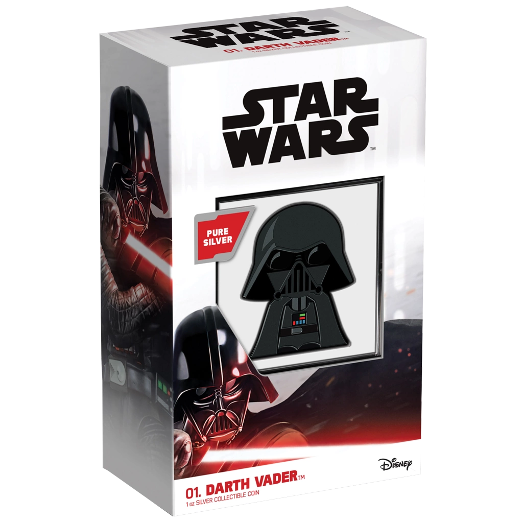 La moneda Darth Vader Chibi Coin coloreada de 1 onza de plata 2020 Proof fue emitida dentro de la serie Star Wars – Chibi Coins. La pieza conmemora al personaje de Darth Vader en el característico estilo Chibi, con una cabeza grande y un cuerpo relativamente pequeño, lo que le confiere un aspecto tierno y divertido. Ha sido acuñada por New Zealand Mint en una onza de plata de 99,9 % con acabado proof. La emisión está limitada a 2.000 ejemplares en todo el mundo y cada unidad se entrega en su caja original junto con un certificado de autenticidad.