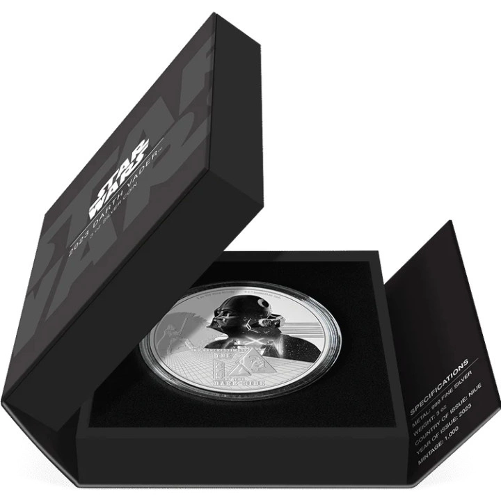 Los resguardos muestran un Darth Vader coloreado e información sobre el peso y la pureza del lingote y los derechos de autor propiedad de Lucas film Ltd..