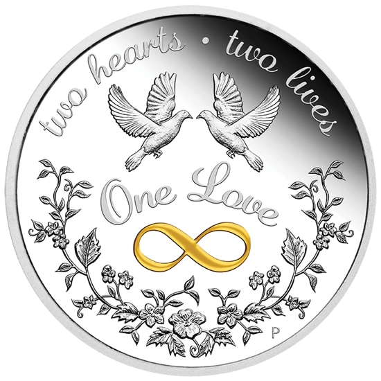 Los anversos muestran dos palomas y un símbolo de infinito coloreado y las inscripciones "UN AMOR", "DOS CORAZONES", "DOS VIDAS".