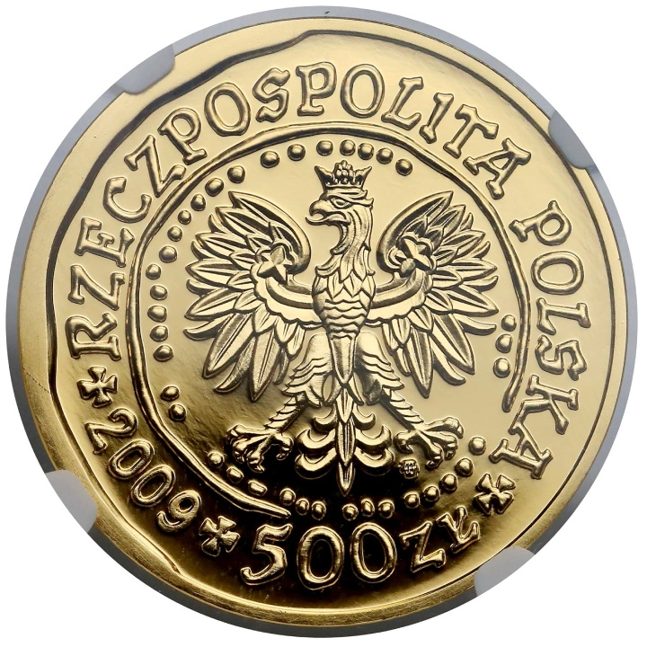 El Anverso está decorado con la imagen del águila establecida para el emblema de la República de Polonia.