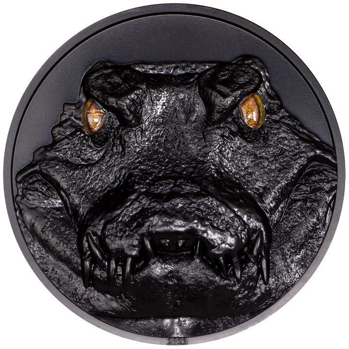 Palaos: Cazadores Nocturnos - Caimán coloreado 2 oz Plata 2023 Negro Obsidiana Ultra Alto Relieve