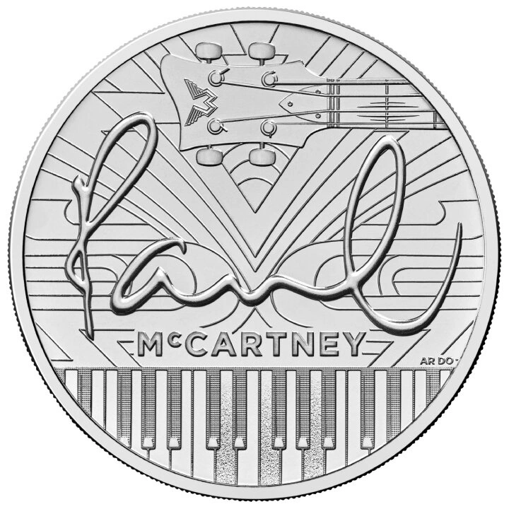 Reverso: Muestra elementos distintivos de la carrera de McCartney, incluidos su icónico "Magic Piano," su característico bajo Höfner en forma de violín, el logotipo de Wings y la firma de Paul McCartney. El diseño del reverso estuvo a cargo de Osborne Ross.