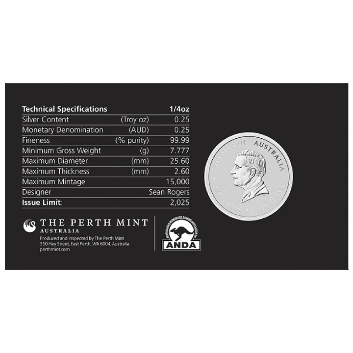 Esta moneda única del Año de la Serpiente fue emitida para el evento numismático de la Sydney Money Expo 2024 ANDA Special. La moneda fue acuñada en plata de ley Ag.9999, pesa 1/4 de onza troy y mide 25,6 mm de diámetro. El renombrado productor de metales preciosos The Perth Mint es el responsable de esta emisión limitada. La moneda está garantizada por el Gobierno australiano en cuanto a la legitimidad y el origen del metal, además de tener plena curso legal en el país emisor. El ejemplar se caracteriza por un elemento de seguridad en forma de letra micrograbada situado en el reverso.
