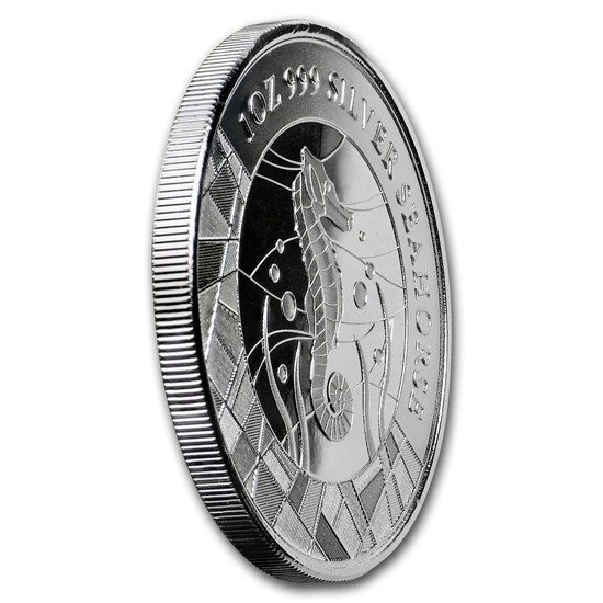El reverso muestra una imagen artística de un caballito de mar, la inscripción "SEAHORSE" e información sobre el peso y la pureza del lingote..