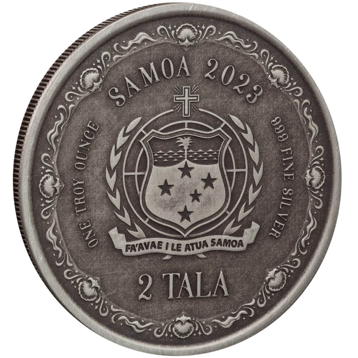 El Anverso de la moneda de plata muestra el escudo de armas de las islas de Samoa junto con información sobre el país emisor, el año de acuñación, la pureza del lingote y el valor facial.
