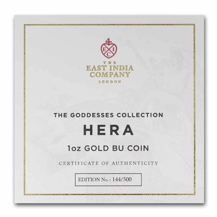 La moneda de oro que representa a Hera es un producto fabricado con lingotes de Au.9999 puro, pesa 1 onza troy y mide 38,61 mm de diámetro. En la mitología griega, Hera es la diosa de la fertilidad y la patrona del matrimonio y la maternidad. Era la esposa de Zeus. Esta moneda está garantizada por el gobierno de Santa Elena y es un medio de pago de pleno derecho en el país. Además, se trata de una moneda de oro cuya acuñación está estrictamente limitada a 500 piezas. Por lo tanto, merece la pena interesarse por esta moneda, así como por toda la serie. La moneda se encuentra en un embalaje individual original.
