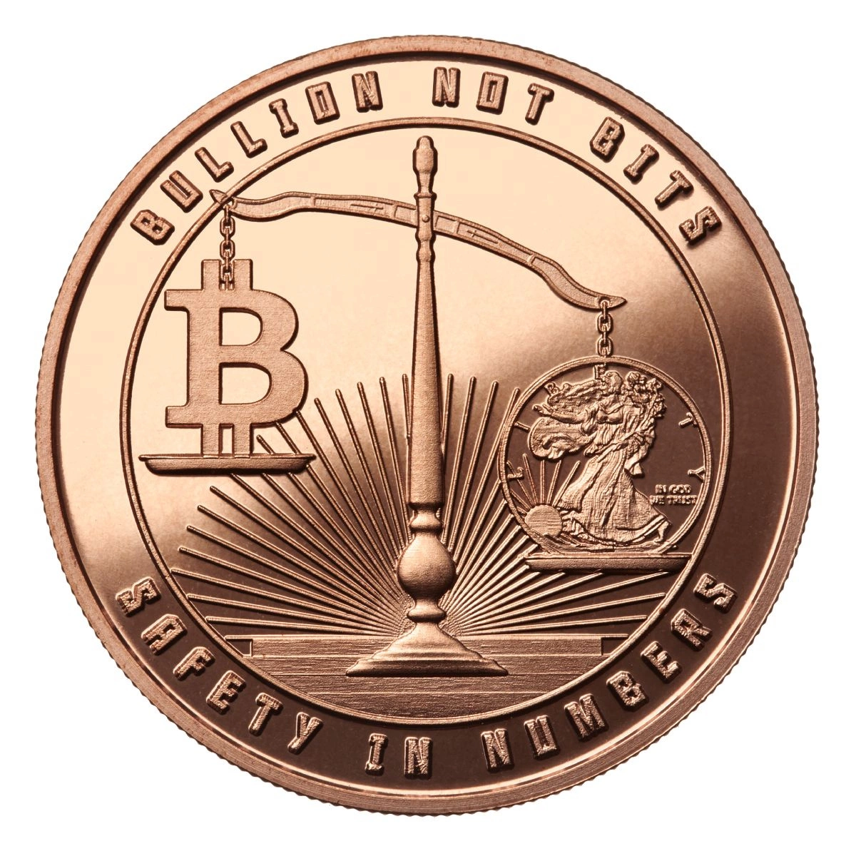 Reverso muestra una balanza clásica de platillos, en la que se han colocado un Bitcoin y la imagen de una moneda tipo Walking Liberty; sobre la composición corre la inscripción “BULLION NOT BITS”, mientras que en la parte inferior de la leyenda se sitúa el lema “SAFETY IN NUMBERS”, reforzado por un fondo radiante que emerge desde la base de la balanza.