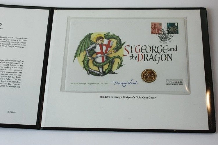 "Bardzo dawno temu, ponoć w III wieku, gdzieś na Wschodzie, najpewniej w Azji Mniejszej pojawił się w królewskim mieście Libba potężny potwór - smok. Ów stwór był okropny, nie dość że odstraszał swoim widokiem, to jeszcze rozsiewał zarazę, zatruwając swym oddechem powietrze. Z tej przyczyny umierało wielu mieszkańców. Chcąc udobruchać i zaspokoić apetyt smoka, przerażeni mieszkańcy postanowili oddawać mu na pożarcie swoje owce, dwie dziennie. Jednak apetyt smoka nie znał granic i w końcu zabrakło owiec. Wobec tego smok zażądał, aby na pożarcie przynoszono mu dzieci, też dwoje dziennie Zrozpaczeni mieszkańcy, wystraszeni okrucieństwem smoka, gotowi byli mu ofiarować na pożarcie własne dzieci. Miały to być młode panny wysokiego rodu - dziewice. Taki los spotkał młodą i piękną córkę króla, który rządził tym miastem. Zrozpaczoną dziewczynę doprowadzono do smoka. A kiedy on zaczął się do niej dobierać, królewna błagała Boga o pomoc. Bóg wysłuchał jej prośby, zlitował się nad odważną dziewicą i zesłał na pomoc wybawiciela - dzielnego rycerza o imieniu Jerzy. Ten zaś zobaczywszy rozpacz dziewicy, uczynił znak krzyża i ugodził kopią potwora. Zraniony smok przeraził się znaku krzyża i przestał być groźny. Królewna na polecenie rycerza - Jerzego zarzuciła smokowi pasek od sukni na szyję i zaprowadziła go na środek miasta. Tam, na rynku miejskim rycerz Jerzy dokończył dzieła i na oczach ludzi czyniąc znak krzyża ściął łeb smokowi. W mieście zapanowała radość. Za wybawienie miasta od wstrętnego smoka, w nagrodę król chciał oddać dzielnemu rycerzowi Jerzemu za żonę swoją wybawioną córkę. Jednak Jerzy czując swoje powołanie do stanu duchownego - odmówił. Wobec tego król postanowił nawrócić się wraz z mieszkańcami na wiarę chrześcijańską i wybudował kościół ku czci Najświętszej Panny Marii i św. Jerzego. Kiedy ukończono budowę świątyni, spod ołtarza trysnęło źródełko. A chorzy którzy z niego napili się odzyskują zdrowie. Jego woda została uznana za leczniczą. Jerzy udał się w dalsza podróż, a zobaczywszy jak poganie prześladowali chrześcijan, rozdał swój majątek biednym i zaczął głosić nauki Chrystusa. To nie za bardzo podobało się władcy pogańskiemu. Uwięził Jerzego. Poddano go torturom, a nawet próbowano otruć. Został skazany m. in. na cierpienia przez łamanie kołem. Pomimo tych cierpień został wierny Chrystusowi. Za to pogański władca skazał go na ścięcie mieczem". Moneta bita jest przez brytyjską mennicę The Royal Mint. Mennica ta została otworzona ponad 1100 lat temu, początkowo produkując monety tylko dla Anglii, ewentualnie dla Wielkiej Brytanii. Początkowo nie było wiadomo, gdzie została zlokalizowana, ale w 1279 roku, mennica przeniosła siedzibę do Tower of London. W 1811 roku ponownie zmienili siedzibę blisko Tower Hill. W 1969 roku przenieśli się do Llantrisant w Południowej Walii. Mennica produkuje większość monet dla Wielkiej Brytanii, a także dla wielu innych krajów. Przy siedzibie mennicy znajduje się mały sklepik z pamiątkami, jednak do samej mennicy wstęp jest zabroniony. Zamknięcie mennicy dla zwiedzających miało miejsce w 1969 roku, ze względów zdrowotnych, bezpieczeństwa i ubezpieczenia. Od 2010 roku działa jako Royal Mint Ltd, spółka należąca do Skarbu Państwa.