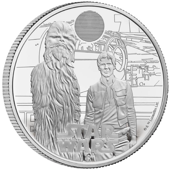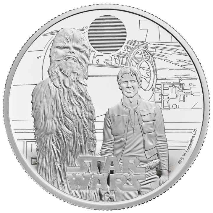 Los anversos de la moneda muestran a Han Solo y Chewbacca, la inscripción "STAR WARS" e información sobre derechos de autor propiedad de Lucas film Ltd.