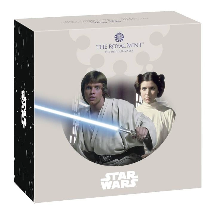 Los anversos de la moneda muestran a Luke Skywalker y la princesa Leia y la inscripción "STAR WARS" e información sobre derechos de autor propiedad de Lucas film Ltd.