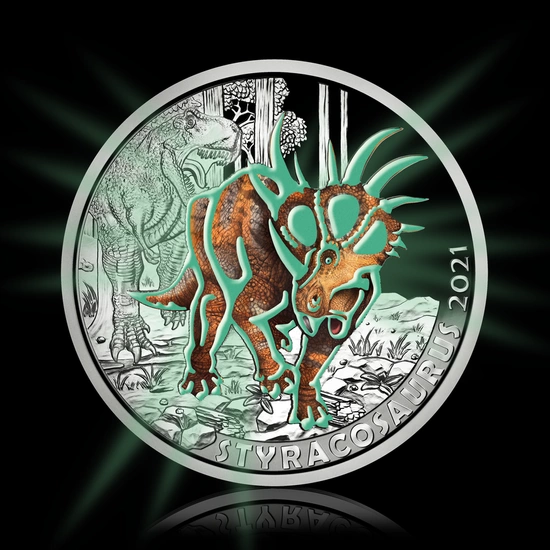 Los reversos muestran un Styracosaurus albertensis coloreado, seguido de un Tyrannosaurus rex. En el reverso figura la inscripción "STYRACOSAURUS" y el año de acuñación de la moneda. El reverso de la moneda brilla en la oscuridad. .