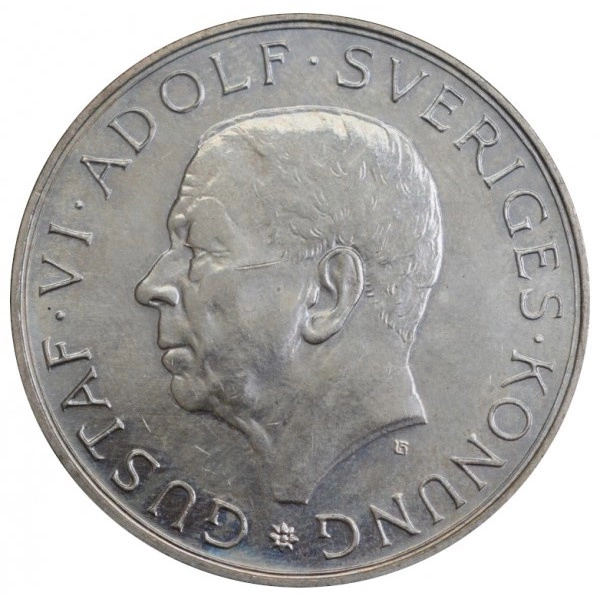 Anverso muestra el retrato del rey Gustavo VI Adolfo junto con la inscripción „GUSTAF VI ADOLF SVERIGES KONUNG”, destacando la majestad del monarca y su importancia histórica.