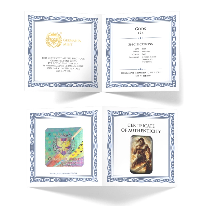 Sztabka Germania Mint: Gods - Týr kolorowany 2 uncje Srebra 2024 Antique Finish