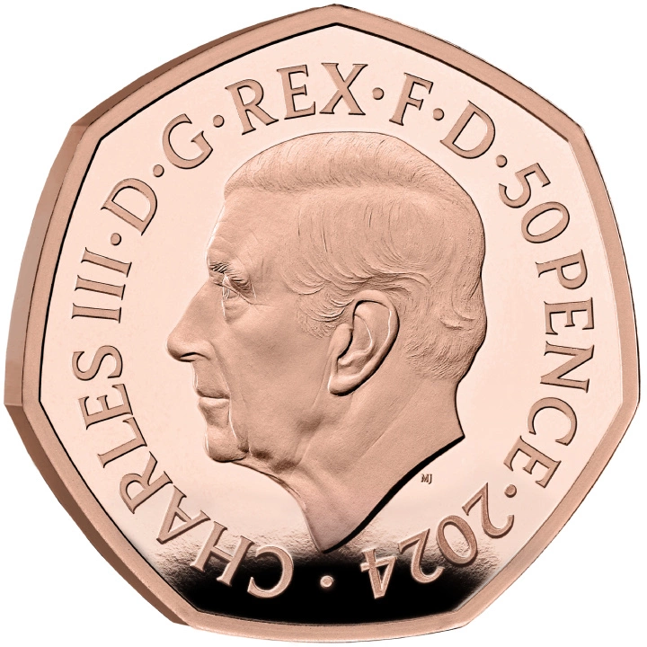 El anverso de la moneda muestra la efigie del rey Carlos III de Gran Bretaña y la denominación y el año, según el diseño de Martin Jennings.