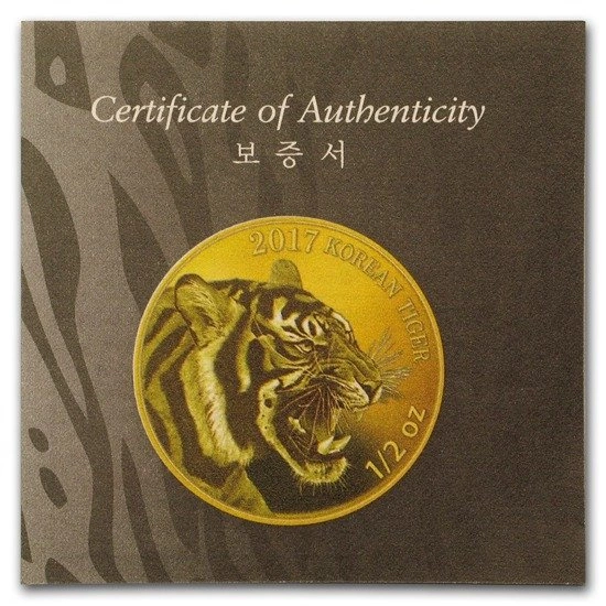 La serie Tigre de Corea se lanzó en 2016 con gran éxito, inicialmente la serie se acuñó en 1/2 y 1/4 de onza de oro, comenzando a acuñarse medallas de 1 onza a partir de 2018. La medalla de oro producida en Corea del Sur por KOMSCO contiene un 99,99% de oro y tiene un peso de 1/2 onza. Esta es la segunda medalla de oro de la serie que se entrega con un certificado de autenticidad. Toda la pieza se presenta en un estuche exclusivo.
