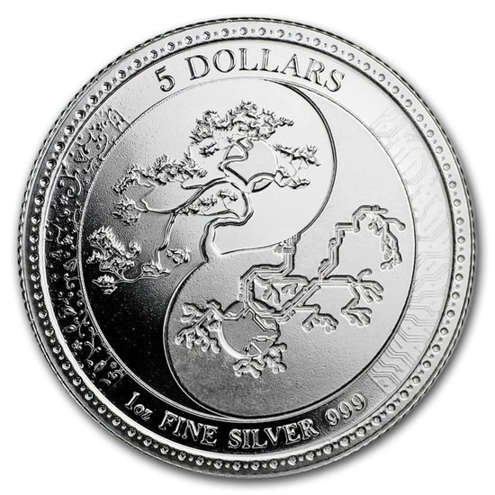 Los reversos muestran la inscripción "EQUILIBRIUM" y el símbolo del Yin y el Yang, como equilibrio entre medio ambiente y tecnología. El reverso muestra el peso, la muestra de lingotes y el valor facial de la moneda.