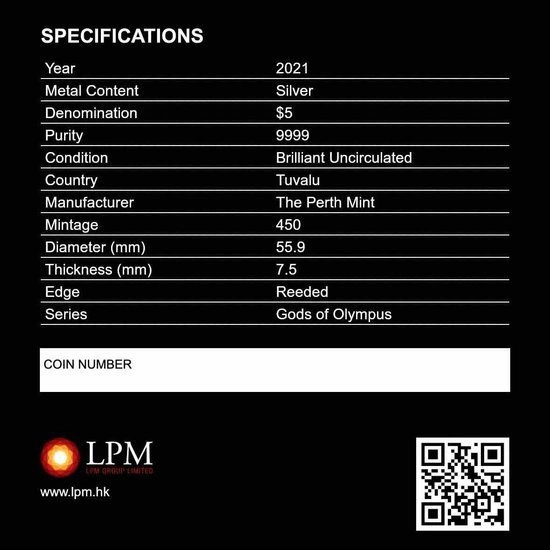 La moneda de plata en lingotes 'Dioses del Olimpo - Poseidón ' es un producto fabricado en lingotes de plata pura 9999, con un peso de cinco onzas troy. Dicha moneda está garantizada por el Gobierno de Tuvalu y es un medio de pago de pleno derecho en el país. Es importante destacar que la Zeus de 5 onzas tiene una acuñación estrictamente limitada de 450 piezas. Cada pieza va acompañada de un certificado de autenticidad.