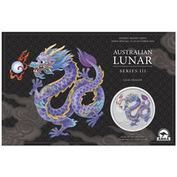 Perth Mint: Lunar III - Año del Dragón 'Lilac Dragon' coloured 1 oz Silver 2024 (Sydney Money Expo Anda Special)