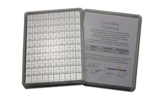 Combibar est un ensemble de 100 lingots d'argent, produits par Valcambi, un fabricant de produits monétaires accrédité par la LBMA. Chaque lingot est fabriqué en argent pur 999, d'un poids de 1 gramme. Tous les lingots sont conditionnés dans un emballage de présentation, le CombiBar. Outre son caractère représentatif, cet emballage constitue une protection idéale pour les lingots. De plus, un certificat d'authenticité est joint à l'ensemble.