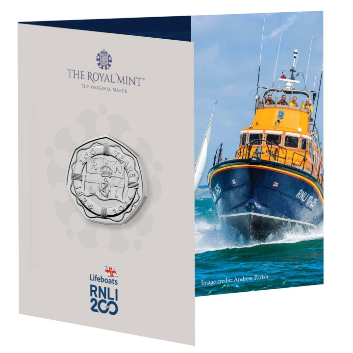 La pièce 200 Years of the RNLI 50p en cuivre-nickel 2024 commémore le bicentenaire de la RNLI (Royal National Lifeboat Institution), une organisation qui s'occupe du sauvetage en mer. La pièce est frappée dans un alliage de cuivre et de nickel, pèse 8 grammes et mesure 27,30 mm de diamètre. Le tirage de la pièce n'est pas limité. De plus, cet exemplaire exceptionnel a été produit par la Monnaie royale britannique. La pièce bénéficie de la garantie du gouvernement britannique quant à sa légalité, la pureté du métal et l'origine du métal, et est également un moyen de paiement légal sur le territoire du pays émetteur. L'avers représente l'effigie du roi Charles III de Grande-Bretagne, ainsi que la valeur faciale et l'année, selon le dessin de Martin Jennings. Le revers de la pièce représente le drapeau de la RNLI entouré d'une bouée de sauvetage et de l'inscription « 200 YEARS », « 1824-2024Designer