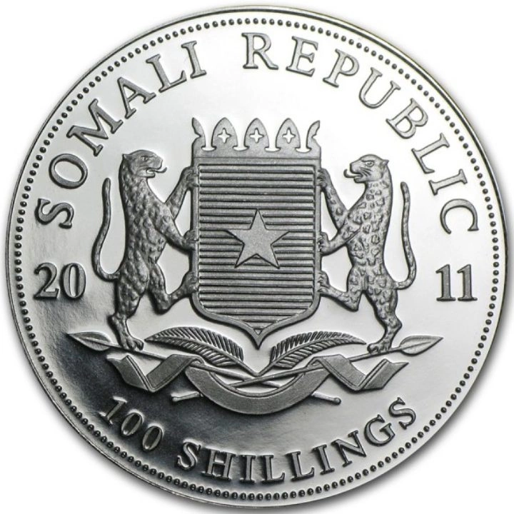La pièce en argent « Éléphant somalien » est la dernière édition d'une série créée en 1999 et baptisée « Éléphant somalien ». Il est intéressant de noter que les premiers exemplaires de la série de 1999 ont été frappés en tant que pièces garanties par le gouvernement zambien. Les exemplaires frappés après 2003 ont un autre garant, à savoir le gouvernement somalien. De plus, la série de pièces en argent et en or « Éléphant somalien » fait partie du programme de collection African Wildlife. L'exemplaire en argent de 2011 a été produit par le fabricant allemand de métaux précieux Bayerisches Hauptmünzamt. Il pèse une once troy, a une pureté de 999,9 et un diamètre de 38,60 mm. De plus, les pièces African Wildlife : Éléphant de Somalie, qui ont été produites après 2004, ont cours légal et sont garanties par le gouvernement somalien quant à leur légalité, la pureté du métal et l'origine du métal.L'avers représente les armoiries de la Somalie, deux léopards soutenant un bouclier avec une étoile, ainsi que l'année de frappe et la valeur nominale de la pièce.Le revers montre un éléphant adulte et un petit éléphant sur fond de steppe africaine. Sur le revers figurent les inscriptions « AFRICAN WILDLIFE », « ELEPHANT » ainsi que des informations sur le poids et la pureté du métal.Fabricant