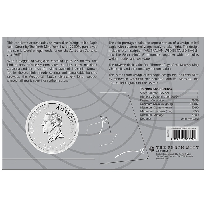 Revers montre un aigle adulte majestueux coloré aux ailes déployées et l'inscription "AUSTRALIAN WEDGE-TAILED EAGLE". L'exemplaire porte des informations sur le poids de la pièce, l'épreuve d'investissement et la date d'émission. Le dessinateur du revers était John M. Mercant. .