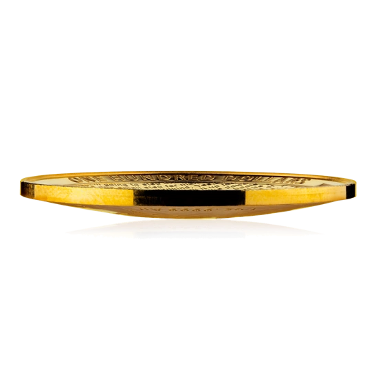 Le revers représente un astronaute d'Apollo 11, le module lunaire et le globe terrestre. Le tout est entouré d'informations sur le poids de la pièce et le titre du métal précieux.