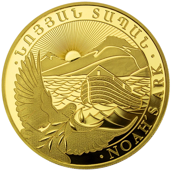 La pièce en or Arche de Noé est un produit d'investissement populaire, frappée dans un poids de 1 once troy et d'une pureté de 999,9. Cette pièce intéressante est émise par la Banque centrale d'Arménie. Cependant, le processus de production lui-même a lieu dans une monnaie privée allemande, la Leipziger Edelmetall Verarbeitung. Les pièces à l'effigie de l'Arche sont garanties par le gouvernement de la République d'Arménie en ce qui concerne leur légalité, la pureté de leur alliage et l'origine du métal, et constituent un moyen de paiement légal dans ce pays. L'avers de la pièce, conçu par Eduard Kurghinyan, représente l'Arche sur une mer agitée, avec le mont Ararat en arrière-plan et le soleil levant en arrière-plan. Le nom de la montagne vient d'Ary, une divinité de l'âge du bronze. Ara était le dieu de la mort et de la renaissance. Au centre de la pièce, on voit une colombe volant au-dessus des eaux du déluge, tenant un rameau d'olivier dans son bec. Sur la tranche, on peut lire l'inscription « Arche de Noé » en anglais (Noah's ark). Le revers de la pièce représente les armoiries de l'Arménie, avec la valeur faciale de 50 000 drams et l'année de frappe. À droite, sous les armoiries, figurent le poids et le titre de l'or dans lequel la pièce a été frappée. Sur le bord inférieur, on peut lire l'inscription « Republic of Armenia ».Fabricant