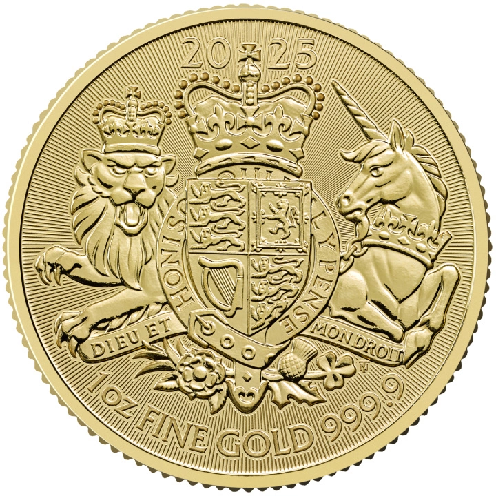 La pièce en or Royal Arms 1 once d'or 2025 est la septième édition de la série de pièces d'investissement The Royal Arms, qui gagne en popularité. Le produit de 2025 a été fabriqué à partir d'or pur de titre Au.9999, d'un poids d'une once troy et d'un diamètre de 32,69 mm. Il s'agit d'un produit provenant du célèbre fabricant britannique de métaux précieux, The Royal Mint. Il convient d'ajouter que la pièce en or Royal Arms est garantie par le gouvernement britannique et constitue un moyen de paiement légal sur le territoire du pays émetteur.Sur l'avers de la pièce figure le portrait du roi Charles III de Grande-Bretagne, d'après un dessin de Martin Jennings. II. On y trouve également des informations sur la valeur nominale de la pièce.Le reversprésente une illustration des armoiries modifiées de la Grande-Bretagne, conçues par le talentueux designer Timothy Noad. Ces armoiries représentent le lion anglais et la licorne écossaise, qui gardent également les armoiries de l'armée du Royaume-Uni de Grande-Bretagne et d'Irlande du Nord. Il est intéressant de noter que l'image contemporaine de la pièce en or s'inspire du projet symbolique « The Royal Arms » d'Eric Sewell. Le revers comporte également des informations sur le poids, la pureté du métal et la date d'émission.Designer