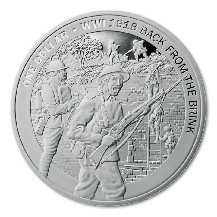La pièce en édition limitée Back from the Brink 1 once d'argent 2018 Proof commémore la Première Guerre mondiale. La Nouvelle-Zélande est entrée en guerre contre l'Allemagne le 5 août 1914, en tant que colonie britannique. La pièce représente l'ascension périlleuse des murs du Quesnoy le 4 novembre 1918. La pièce en argent a été frappée dans un métal pur de titre Ag.999, d'un poids de 1 once troy et d'un diamètre de 40 mm, dans la norme proof. Elle a été réalisée par la Royal Australian Mint, mais frappée à la demande de la New Zealand Post. Ce produit est un moyen de paiement légal en Nouvelle-Zélande. Le tirage de la pièce en argent est limité à 2 500 exemplaires, tous livrés dans leur boîte d'origine avec un certificat d'authenticité. L'avers représente le portrait de la reine Elizabeth II, dessiné par Ian Rank-Broadley. L'avers comporte également des informations sur le poids, la pureté du métal, le pays émetteur et la date d'émission. Le revers de la pièce en argent représente des soldats escaladant le mur du Quesnoy. Le revers comporte également des informations sur la valeur nominale de la pièce.Besoin d'aide ? Avez-vous des questions ?Posez votre question et nous vous répondrons rapidement. Les questions et les réponses les plus intéressantes seront publiées pour que d'autres puissent les consulter.