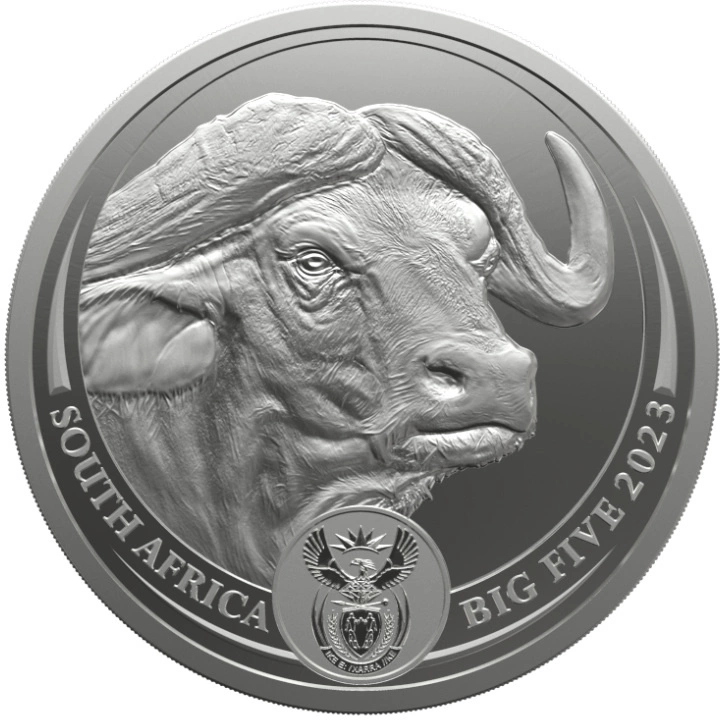The Big Five II: Buffalo 1 oz Silver 2023 coin is the fifth installment of the second series - Big Five II. The first series was very popular with collectors and buyers. The limited edition African Big Five series features animals - the elephant, lion, rhino, leopard, and buffalo. The coin depicts a buffalo. These animals are mainly herbivores. The silver bullion coin is minted from pure Ag.999 silver, weighs 1 troy ounce and has a diameter of 38.73 mm. This unique coin was produced by the renowned South Africa Mint and is legal tender in the country of issue. The entire series is guaranteed by the South African government in terms of legality, purity, and origin of the metal. The silver buffalo has a mintage of only 20,000 pieces. Individual coins are delivered in a representative package, which provides additional information about both the coin and the animal itself. The obverse shows the head of a buffalo and the inscriptions “SOUTH AFRICA,” “BIG FIVE 2023,” and the coat of arms of South Africa. The reverse shows two halves of a buffalo's head. The reverse also features the inscription “FIVE RAND” and information about the weight and purity of the metal. Placing several coins in one position allows you to see the entire group of buffaloes.Fabricant