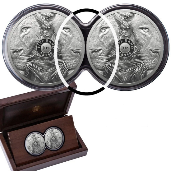 Le produit Big Five II : Set Lion 2 x 1 once d'argent 2022 Proof est un ensemble contenant des pièces qui constituent la deuxième édition de la deuxième série - Big Five II. La première série a remporté un vif succès auprès des collectionneurs et des acheteurs. La série limitée du Big Five africain comprend les animaux suivants : l'éléphant, le lion, le buffle, le rhinocéros et le léopard. La pièce représente le lion africain, considéré comme le roi de tous les animaux d'Afrique. Les pièces ont été frappées dans un métal pur de titre Ag.999, d'un poids de 1 once troy et d'un diamètre de 38,73 mm, dans la norme proof. Elles ont été produites par la célèbre Monnaie sud-africaine et sont un moyen de paiement officiel dans le pays émetteur. Toute la série bénéficie de la garantie du gouvernement sud-africain quant à la légalité, la pureté du métal et l'origine du métal. Le set est limité à seulement 1 000 exemplaires et est présenté dans un emballage individuel original. L'avers représente la tête d'un lion africain et l'inscription « SOUTH AFRICA », « BIG FIVE 2022 » et les armoiries de l'Afrique du Sud. Le revers représente les deux moitiés de la tête d'un lion. Il comporte l'inscription « FIVE RAND » ainsi que des informations sur le poids et la pureté du métal. En plaçant plusieurs pièces dans une même position, il est possible de représenter tout un troupeau de lions.Fabricant