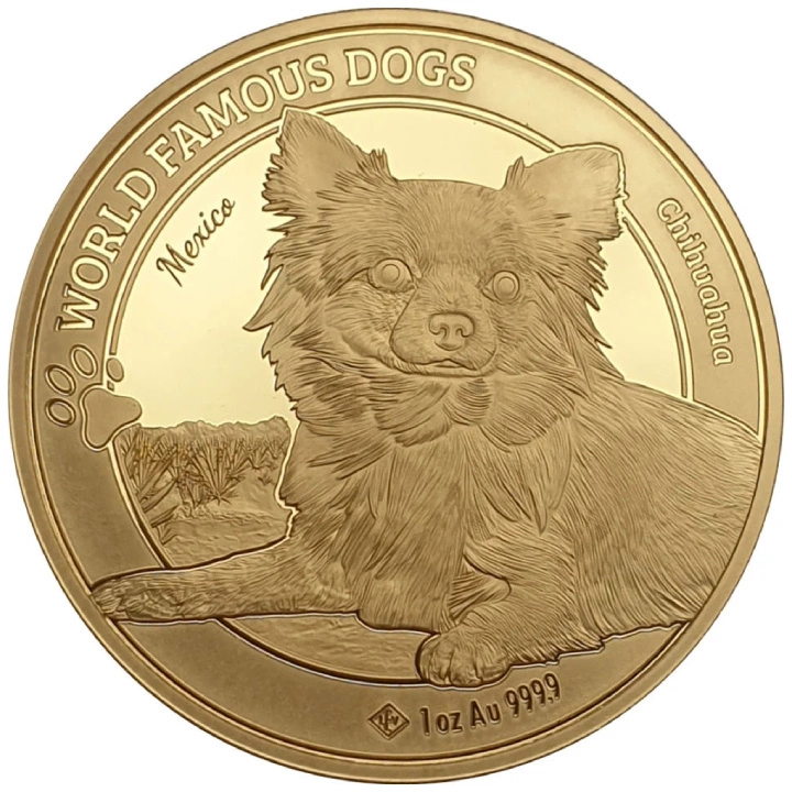 The gold bullion coin featuring a Chihuahua is the third coin in the World Famous Dogs series. The series will consist of 10 coins. The name of the breed “Chihuahua” comes from the state and city in northern Mexico. The animal is considered the smallest dog in the world. Cameroon: World Famous Dogs - Chihuahua 1 oz Gold 2023 is a coin made of pure Au.9999 gold, weighing one troy ounce and measuring 38.6 mm in diameter. It is produced by the German precious metals manufacturer Leipziger Edelmetallverarbeitung. The 2023 gold coin was minted in a limited edition of 1,000 pieces. In addition, it is a product that is legal tender and is guaranteed by the government of the Republic of Cameroon. All coins are delivered in original mint capsules. The obverse of the gold coin features an image of Queen Elizabeth II and the coat of arms of the Republic of Cameroon, as well as information about the year of minting and the face value of the coin. The reverse shows a Chihuahua and information about the weight and purity of the metal. Above the image of the dog is the inscription “WORLD FAMOUS DOG,” “MEXICO,” and “CHIHUAHUA.”Fabricant