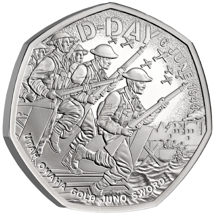 La pièce D-Day 50p en cupronickel 2024 commémore le 80e anniversaire du débarquement. Le 6 juin 1944, plus de 132 000 soldats terrestres et 18 000 parachutistes ont réussi à attaquer cinq plages de débarquement le long de la côte normande en France. La prise de ce tête de pont sur le continent européen a permis aux Alliés d'ouvrir un deuxième front contre l'Allemagne, ce qui a contribué à changer le cours de la Seconde Guerre mondiale. La pièce est frappée dans un alliage de cuivre et de nickel, pèse 8 grammes et mesure 27,30 mm de diamètre. Le tirage de la pièce est illimité. De plus, cet exemplaire exceptionnel a été produit par la Monnaie royale britannique. La pièce bénéficie de la garantie du gouvernement britannique quant à sa légalité, la pureté du métal et l'origine du métal, et est également un moyen de paiement légal sur le territoire du pays émetteur. L'avers représente l'effigie du roi Charles III de Grande-Bretagne, ainsi que la valeur faciale et l'année, selon le dessin de Martin Jennings. Le revers de la pièce représente une œuvre du célèbre artiste David Lawrence, qui montre des soldats alliés risquant leur vie pour débarquer, avec les inscriptions « 6 JUNE 2024 », « D-DAY », « UTAH OMAHA GOLD JUNO SWORD ».Designer