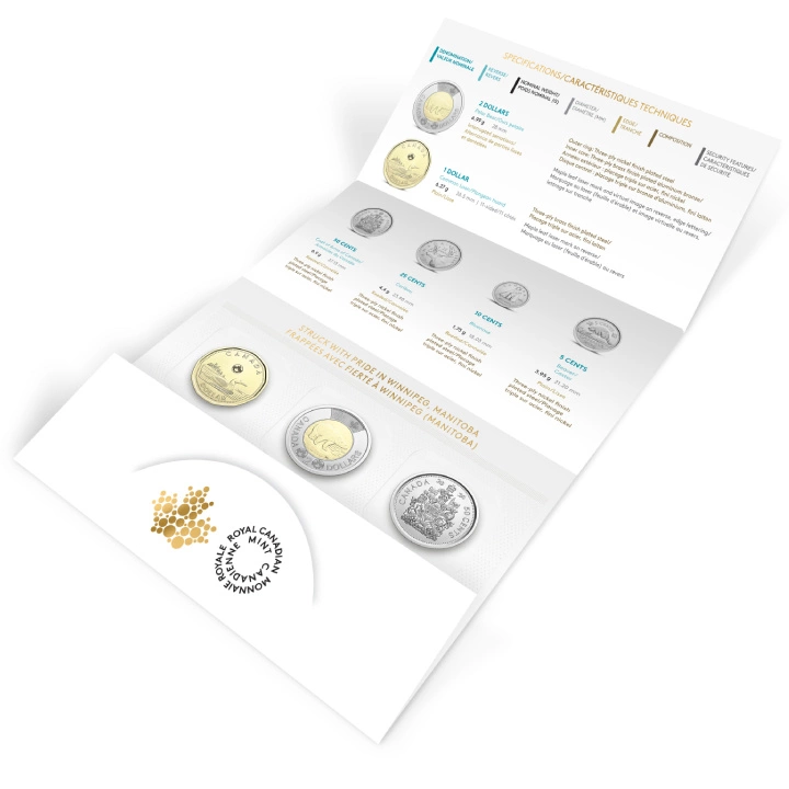 Le coffret Canada : Canadian Classic 6 pièces 2024 est un produit intéressant qui fait référence aux principaux symboles du Canada. Les pièces sont frappées avec un ajout d'alliage de cuivre et de nickel, ainsi que de brome et d'aluminium. Les pièces ont les valeurs suivantes : 2 dollars, 1 dollar, 50 cents, 25 cents, 10 cents, 5 cents. Par ordre décroissant de valeur faciale, les produits ont un poids et un diamètre de : 6,99 g et 28 mm, 6,27 g et 26,5 mm, 6,9 g et 27,13 mm, 4,4 g et 23,88 mm, 1,75 g et 18,03 mm, 3,95 g et 21,2 mm. Chaque exemplaire est présenté dans un emballage individuel. Cet ensemble exceptionnel a été produit par la Monnaie royale canadienne, avec un tirage limité à 100 000 exemplaires. Les pièces sont garanties par le gouvernement canadien quant à leur légalité, la pureté du métal et l'origine du métal, et sont également un moyen de paiement légal sur le territoire du pays émetteur. Les avers représentent le portrait du roi Charles III, d'après un dessin de Steven Rosati. Les revers représentent respectivement : un ours polaire, un canard « Common Loon », les armoiries du Canada, un renne « Caribou », un voilier « Bluenose » et un castor.Fabricant
