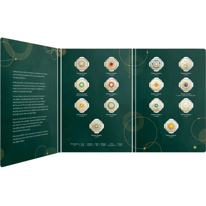 La Royal Australian Mint a produit une collection étonnante de quatorze pièces - 35th Anniversary of the Two Dollar colored Aluminum Bronze 2023, comprenant une sélection de dessins commémoratifs qui ont figuré au revers de la pièce australienne de 2 dollars. Depuis leur introduction sur le marché en 1988, les motifs qui ont figuré sur la pièce de deux dollars australienne rendent hommage à de nombreux personnages et événements historiques. Ces pièces exceptionnelles sont en bronze d'aluminium, pèsent 6,60 grammes et ont un diamètre de 20,50 mm. Le tirage de cette pièce est de 35 000 exemplaires. Ces produits exceptionnels sont emballés dans un emballage original. L'émetteur de cette pièce est le célèbre fabricant mondial de produits d'investissement, la Royal Australian Mint. Les pièces ont cours légal et sont garanties par le gouvernement australien quant à leur légalité, la pureté du métal et l'origine du métal. Les avers représentent l'effigie de la reine Elizabeth II de Grande-Bretagne couronnée, l'inscription « ELIZABETH II 1952-2022 » ainsi que l'année de frappe, le pays émetteur et la valeur nominale. L'avers a été conçu par Jody Clark. Le revers des pièces présente des motifs commémoratifs colorés qui figuraient au revers des pièces australiennes de deux dollars.Designer