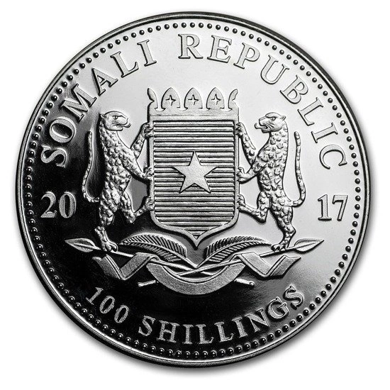 "Słoń afrykański (Loxodonta africana) – gatunek ssaka z rodziny słoniowatych, największe współcześnie żyjące zwierzę lądowe. Wcześniej uznawany za jeden gatunek wraz z afrykańskim słoniem leśnym (Loxodonta cyclotis). Zwierzę stadne, zamieszkuje afrykańską sawannę, lasy i stepy od południowych krańców Sahary po Namibię, północną Botswanę i północną część Afryki. W starożytności wykorzystywane jako zwierzęta bojowe. Słonie afrykańskie są uważane za zwierzęta obdarzone wysoką inteligencją. Mózg słonia waży ok. 6000 g (czterokrotnie więcej niż mózg człowieka). Przeciętna długość życia słonia wynosi około 65-70 lat w stanie dzikim i do 80 lat w niewoli. Notowano przypadki słoni osiągających ponad 80 lat. Najstarsze skamieliny słoni afrykańskich pochodzą ze środkowego pliocenu. Mimo że słoń afrykański jest właściwie zwierzęciem sawanny, potrafi przystosować się do innych warunków, dzięki czemu może żyć na obszarach położonych na południe od Sahary. Osiedla się jednak tylko tam, gdzie znajdują się źródła wody pitnej i miejsca do kąpieli. Największy zarejestrowany cios słonia mierzył 3,1 m i ważył niemal 105 kg"Mennica bawarska Bayerisches Hauptmünzamt jest europejską mennicą usytuowaną w Monachium, działa od 1871 roku. Jedna z czterech niemieckich mennic upoważniona do bicia monet dla rządu łotewskiego.Srebro znajduje zastosowanie głównie jako metal szlachetny. Srebro próby 925 w stopie z miedzią jest używane do produkcji biżuterii, naczyń i sztućców. Używa się go też do produkcji medali. Instrumenty muzyczne wysokiej klasy, takie jak flety, są wytwarzane z tego stopu. Srebro jest bardzo ciągliwym i kowalnym (nieco twardszym od złota), jednowartościowym metalem 11 grupy, z lśniącym połyskiem, dającym się łatwo polerować.Awers przedstawia herb Somalii- dwa lamparty podtrzymujące tarczę z biała gwiazda- wraz z rokiem bicia oraz nominałem.Na rewersie monety został przedstawiony wizerunek somalijskiego słonia, a także waga i próba.Fabricant