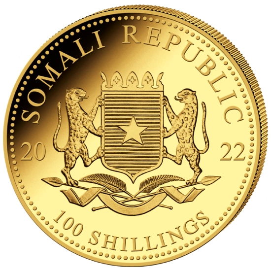 La pièce en or Éléphant somalien est la dernière édition d'une série créée en 1999 et baptisée Éléphant somalien. Il est intéressant de noter que les premiers exemplaires de la série de 1999 ont été frappés en tant que pièces garanties par le gouvernement zambien. Les exemplaires frappés après 2003 ont un autre garant, à savoir le gouvernement somalien. De plus, la série de pièces en argent et en or Éléphant de Somalie fait partie du programme de collection African Wildlife. La pièce en or de 2022 a été produite par le fabricant allemand de métaux précieux Bayerisches Hauptmünzamt, avec un poids de 1/10 once troy et un titre de 999,9 millièmes. De plus, les pièces African Wildlife : Éléphant de Somalie (African Wildlife : Somalia Elephant), qui ont été produites après 2004, ont cours légal et sont garanties par le gouvernement somalien quant à leur légalité, la pureté du métal et l'origine du métal. L'avers représente les armoiries de la Somalie, deux léopards soutenant un bouclier avec une étoile, ainsi que l'année de frappe et la valeur nominale de la pièce. Le revers représente un éléphant somalien avec un petit éléphanteau dans leur environnement naturel.Fabricant